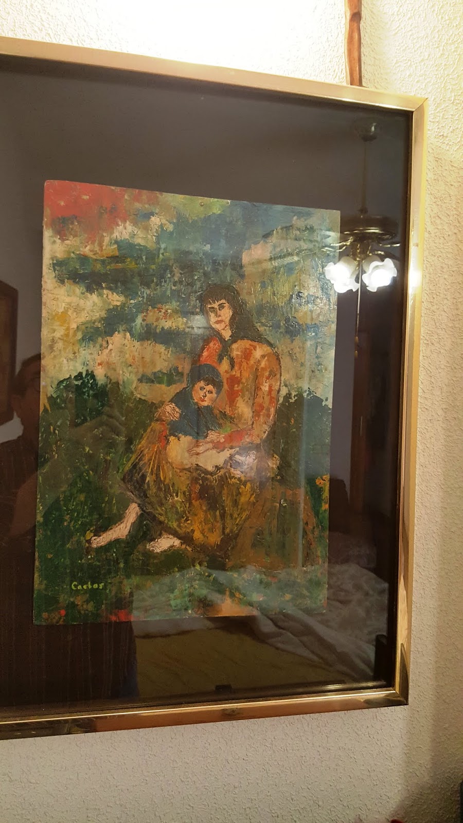 este de abajo se lo pinté a mi madre con 15 años en el 1965, esta realizado con espátula y fue el primero con esa técnica, lo tengo protegido con un cristal porque es pintura al oleo sobre un cartón de publicidad y pudiera deteriorarse ...este y el Payaso son los primeros que pinté...